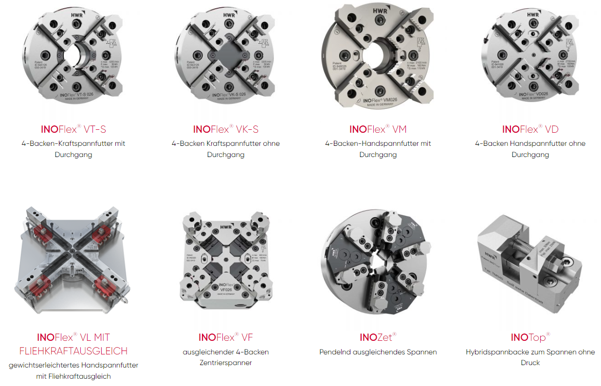 Die universellen, präzisen Spannmittel InoFlex®​ von HWR Spanntechnik vereinen die Vorteile und Funktionen vom 2-, 3- und 4-Backenfutter sowie vom Fixanschlagsschraubstock und vom Zentrumspanner. Tatsächlich kann man alle diese Spannmittel sowohl für das konzentrische Spannen von kubischen wie auch runden Bauteilen mit einem einzigen InoFlex® ersetzen! Die Spanner sind in verschiedenen Ausführungen und Grössen verfügbar.