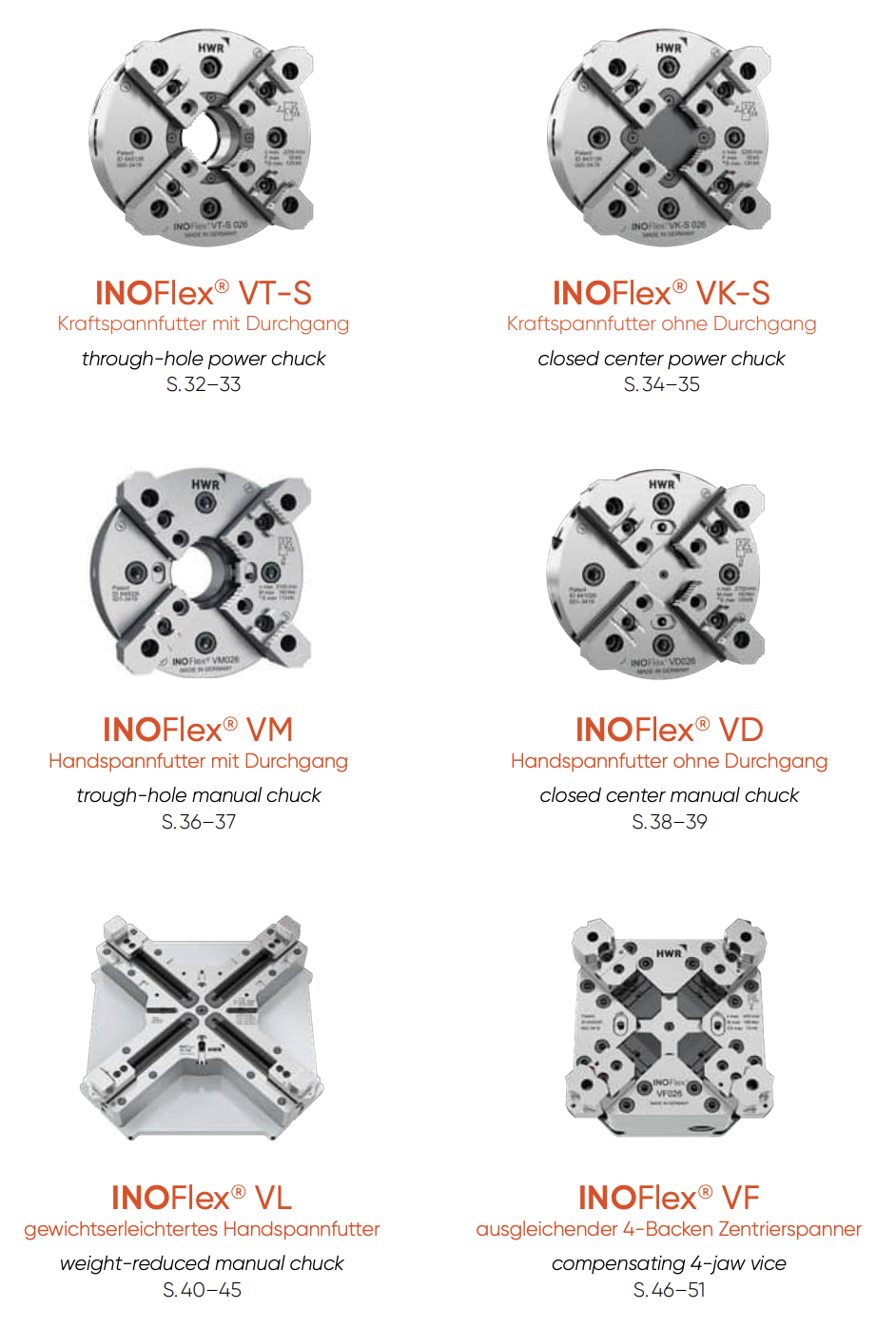 INOFlex®VL von HWR Spanntechnik ist das universelle Spannmittel fürs Fräsen. Es bietet die Vorteile und Funktionen vom 2‐, 3‐, 4‐Backenfutter und Schraubstock und vermeidet dabei, durch den patentierten Ausgleich, die Nachteile wie z. B. Überbestimmtheit. Durch die 4-Backen-Anordung in einer 90° Teilung ergeben sich eine Vielzahl von Kombinationsmöglichkeiten. So können beispielsweise 2 gegenüberliegende Backen als Zentrierspanner verwendet werden. Wird eine eindeutige Bezugskante benötigt, können bis zu 2 Festanschläge verwendet werden.